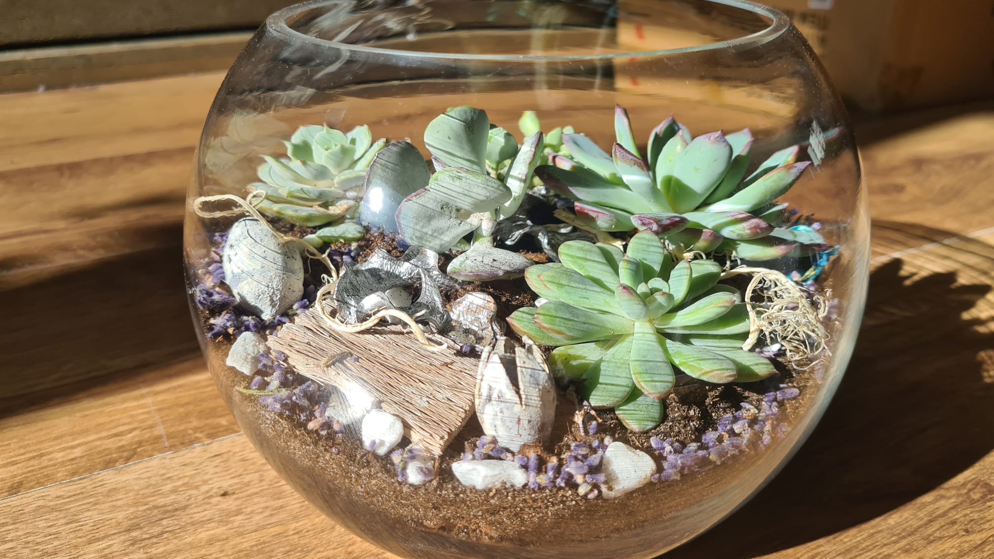 Așezat la lumină, dar *fără soare direct*, care poate supraincălzi sticla . Lângă o fereastră luminoasă este ideal. La fiecare udare sau daca vezi plantele ca se apleaca dupa lumina poti roti gradina catre soare cu partea care a fost umbrita.