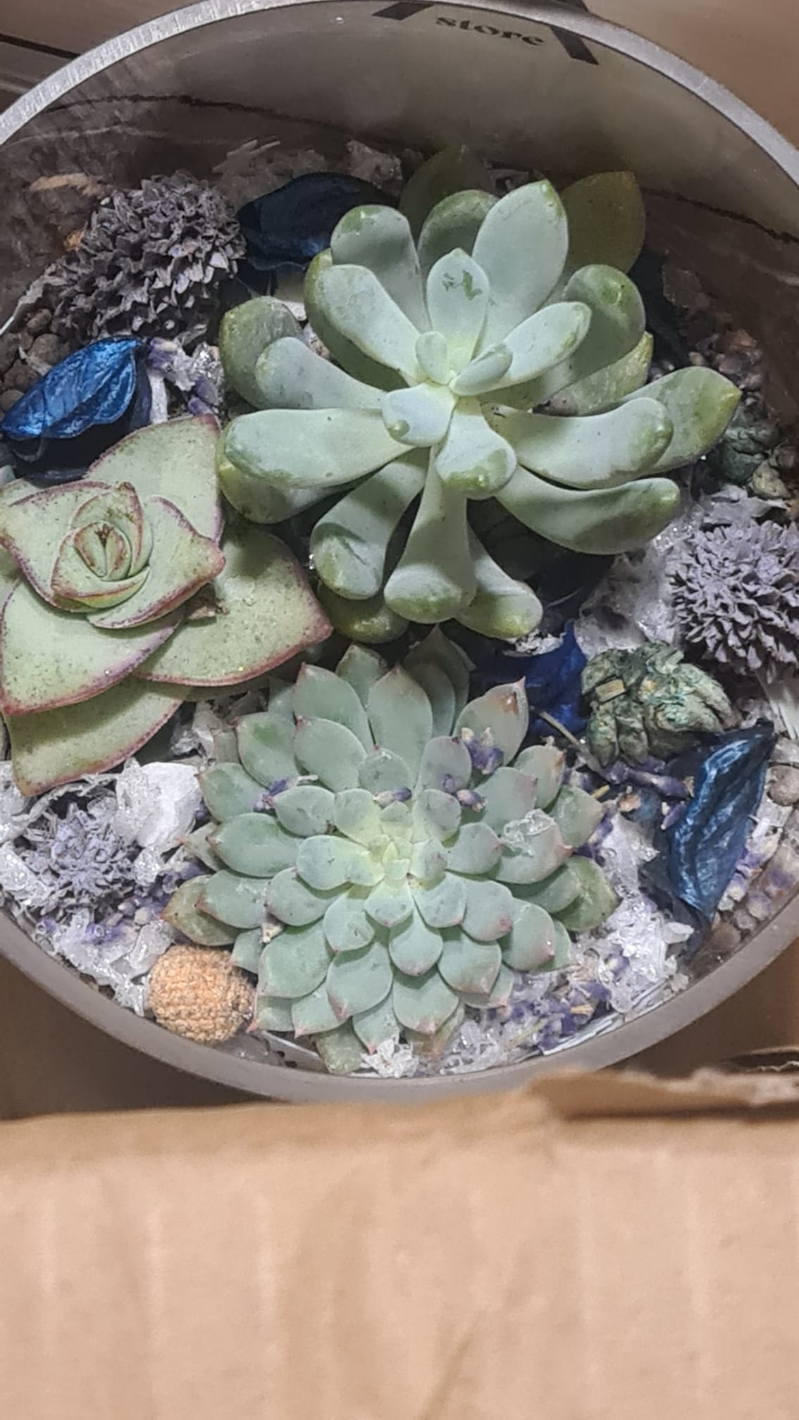 Conține suculente rezistente, în combinații diferite — fiecare plantă aleasă pentru formă, culoare și armonie în ansamblu. Plantele suculente sunt plante care traiesc in medii uscate si pastreaza apa in frunze si tulpina. Mai sunt asemanate cu camilele plantelor, asa ca nu le udati asemenea altor plante. Ofetiti-le putina apa si multa atentie.